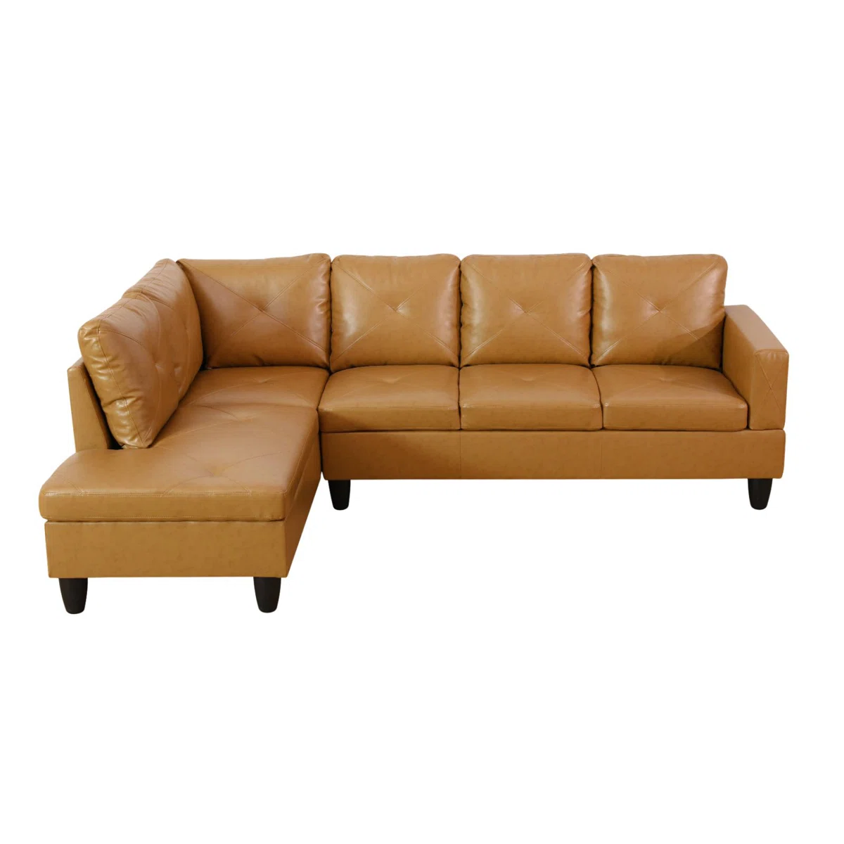 This sectional with chaise easily seats up to four guests, so it’s ideal for movie night in the living room or den. The frame is built on plastic feet with a dark brown finish, and it’s wrapped in your choice of neutral-colored Faux Leather that complements your modern decor. This clean-lined sofa and chaise are cushioned, giving you plenty of support while you relax. And we love that the chaise allows you to place down a tray of snacks or kick up your feet after a long day. Assembly is required.